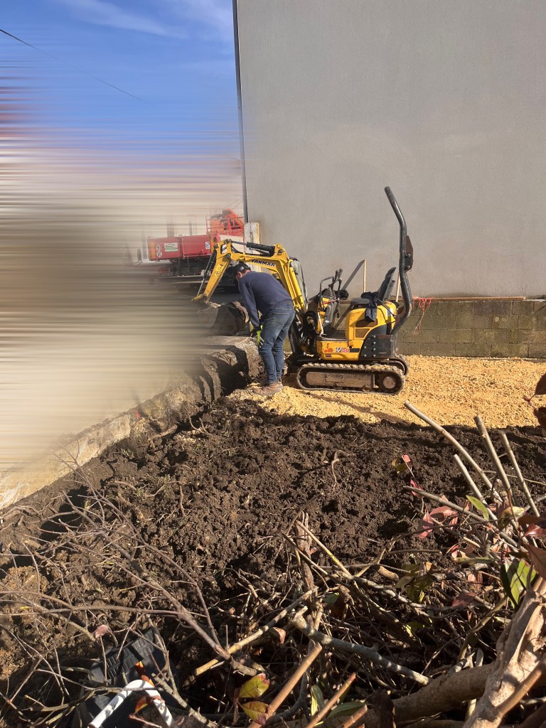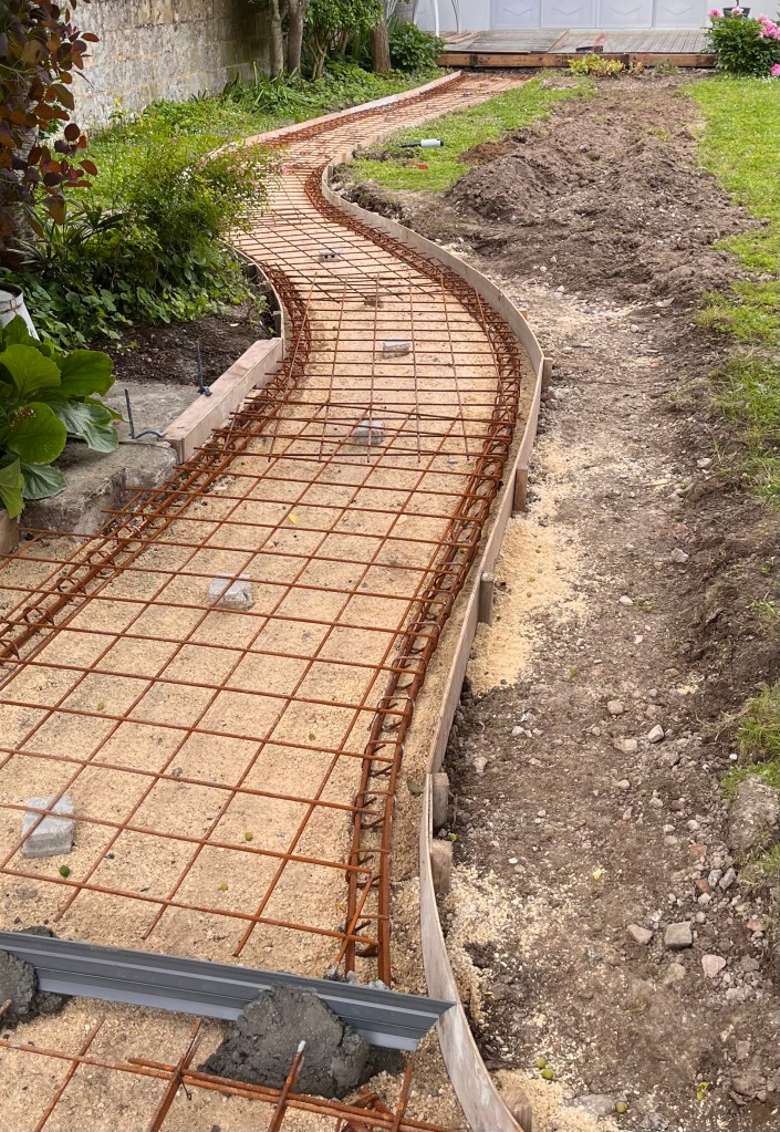 Coffrage et ferraillage d’une allée de jardin avant coulage.